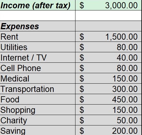How do we keep track of our spending with so many expenses? That brings us to the topic this month: Budgeting. A budget is a plan for spending. Essentially, add up what you earn or take home every month and subtract spending in each category. We can use the following budget as a case study.